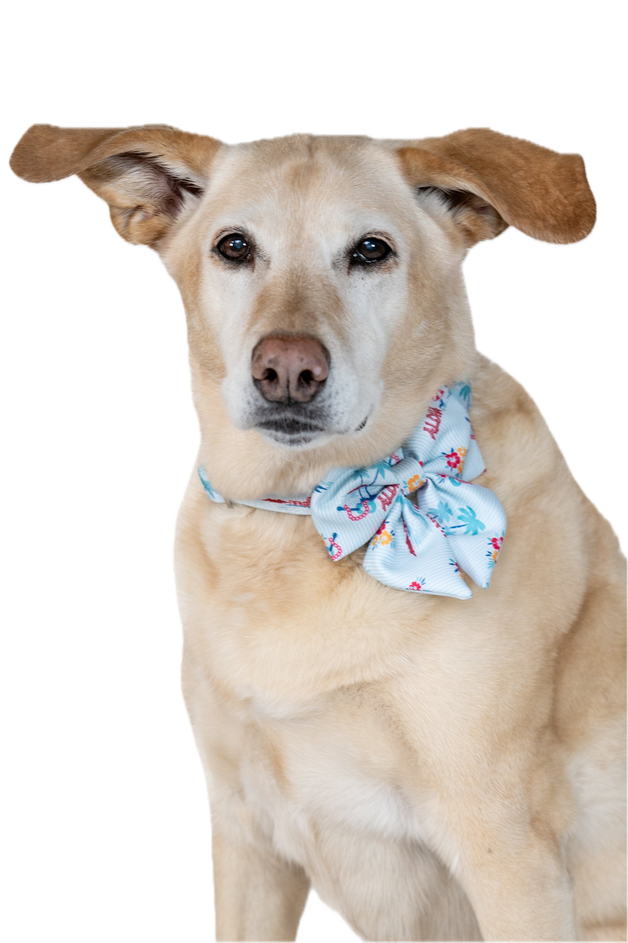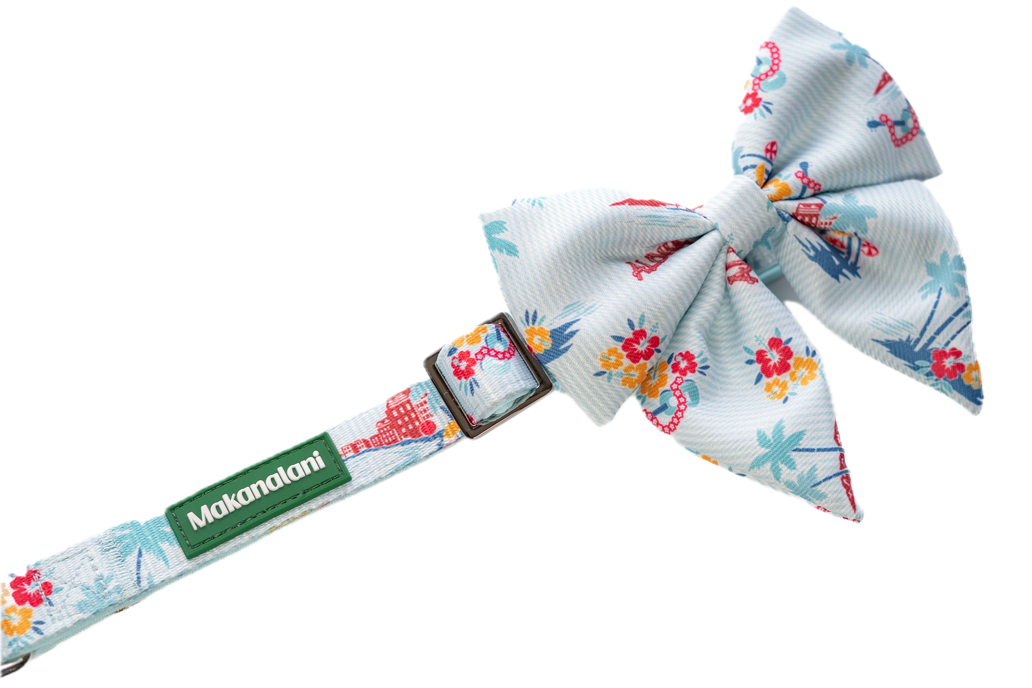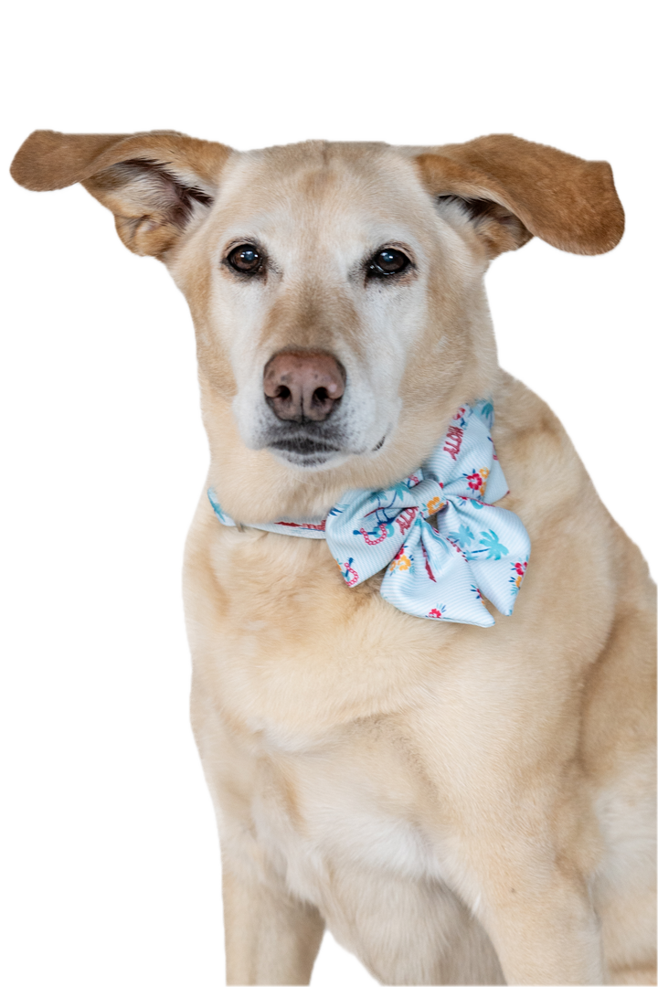 Designed for the stylish pet, the bow adds a touch of sophistication to the relaxed island print, making it versatile for casual strolls around the neighborhood as well as dressy family occasions.