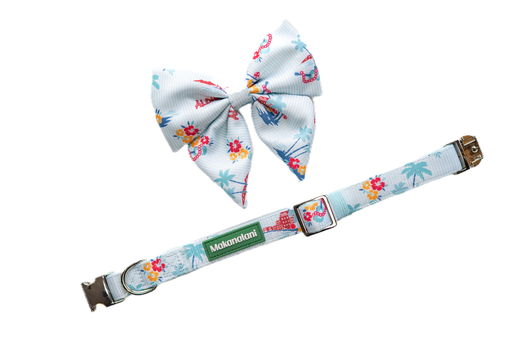 The Beach Front Bow Collar Set comes in multiple sizes to fit most pets. The design features our signature Hawaiian prints — perfect for pets with big personalities and even bigger aloha spirit. These bow collars will transport your pet to the tropics. It is the perfect accessory for the furry family member who brings sunshine wherever they go.