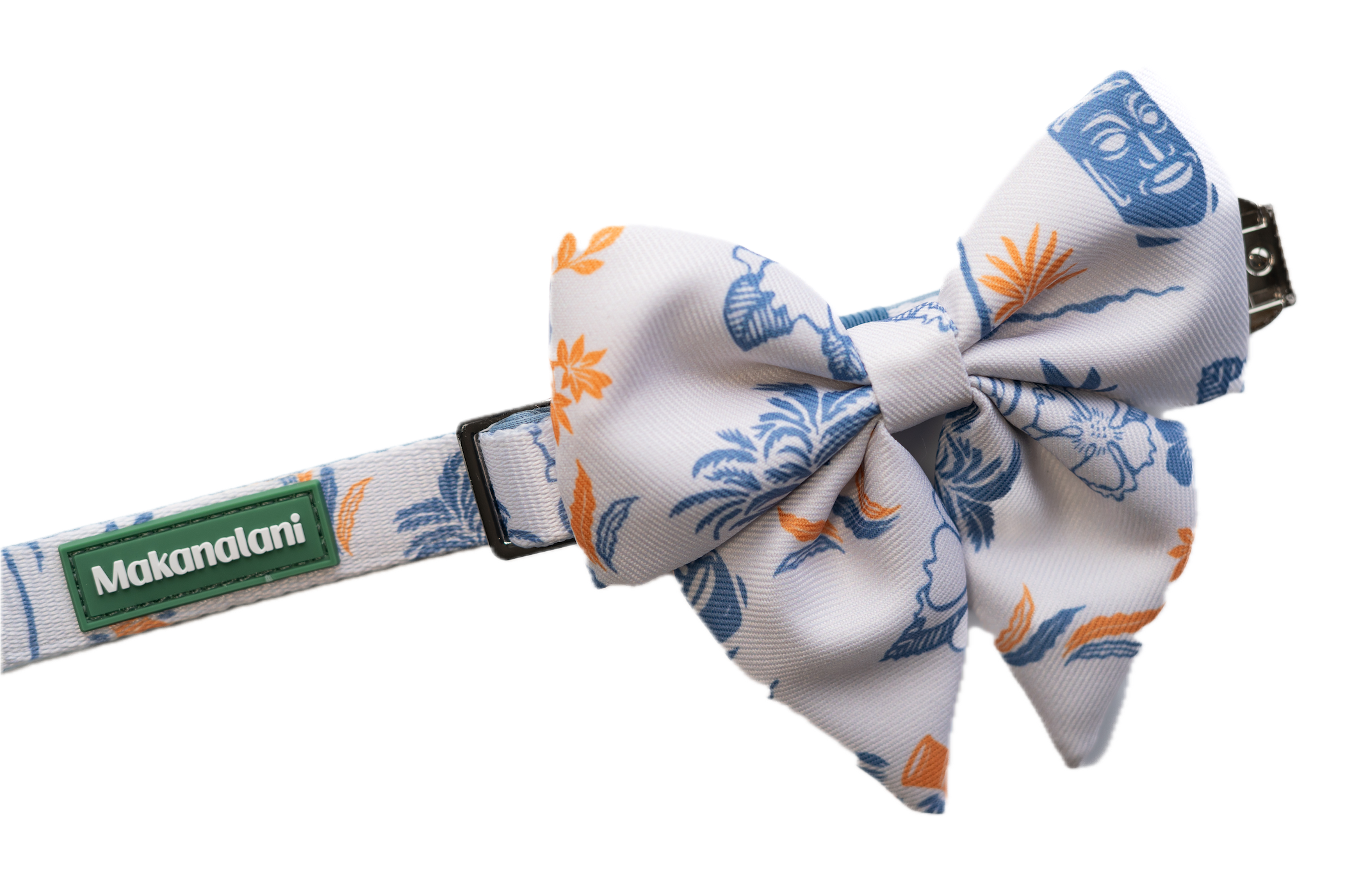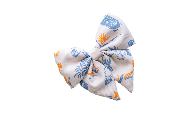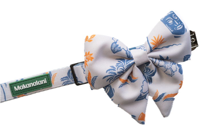 Designed for the stylish pet, the bow adds a touch of sophistication to the relaxed island print, making it versatile for casual strolls around the neighborhood as well as dressy family occasions.