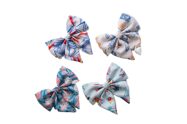 The Hula Bow Collar Set comes in multiple sizes to fit most pets. The design features our signature Hawaiian prints — perfect for pets with big personalities and even bigger aloha spirit. These bow collars will transport your pet to the tropics. It is the perfect accessory for the furry family member who brings sunshine wherever they go.
